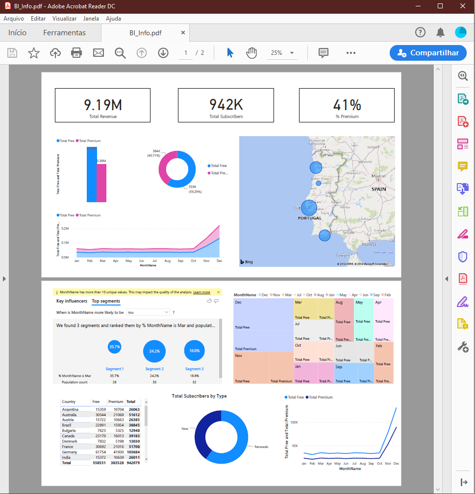 Os Dashboards / Reports publicados podem ser exportadosa para PDF ou Power Point e os ficheiros exportados disponibilizados de alguma forma e/ou enviados por email. O exemplo seguinte é de uma exportação para PDF.