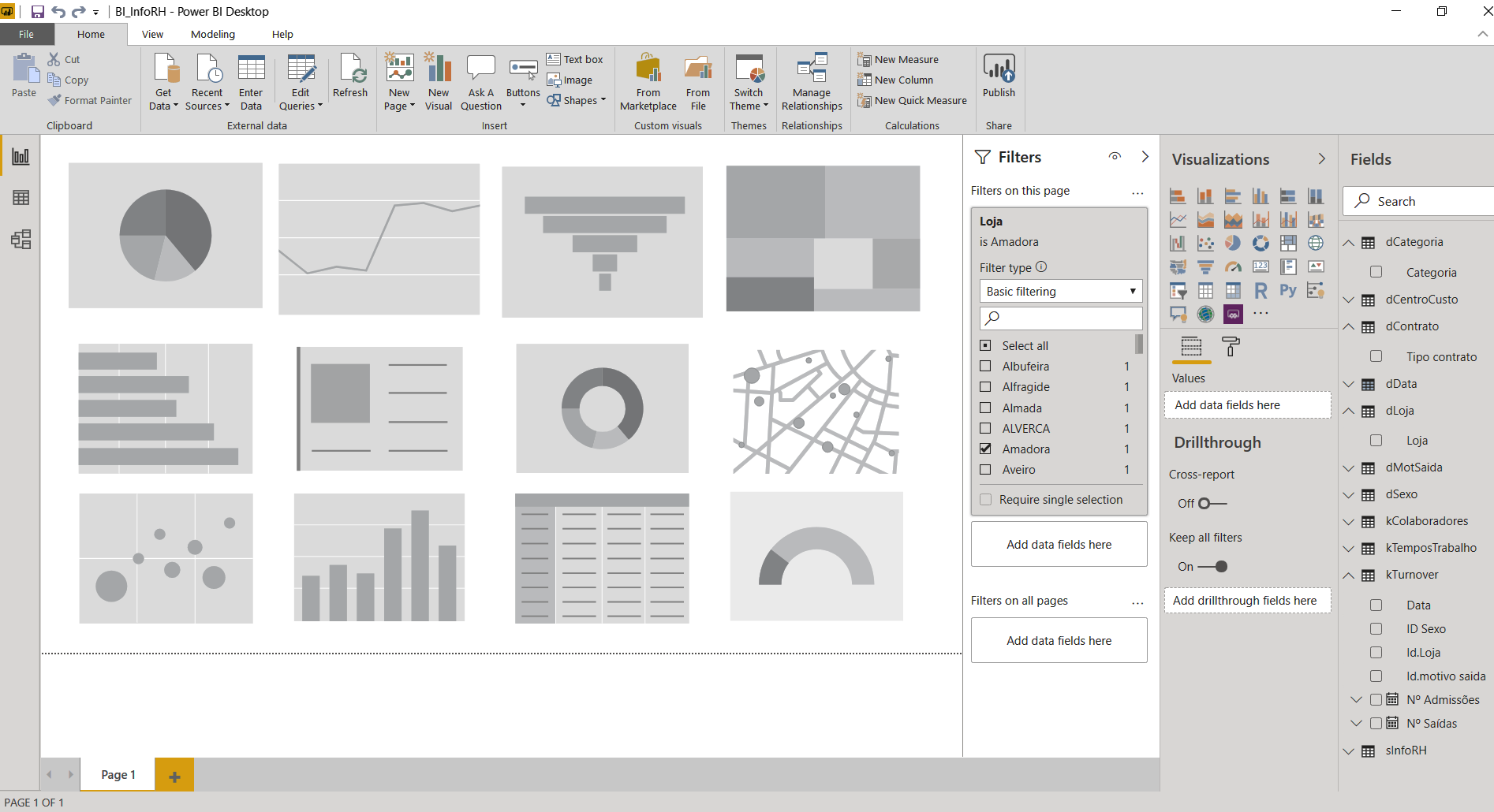 No caso, para exemplificar, foram puxados muitos dos tipos de visualizações disponíveis. Ainda não têm dados pelo que aparecem a cinzento com imagens elucidativas dos tipos de visualizações de que se tratam.