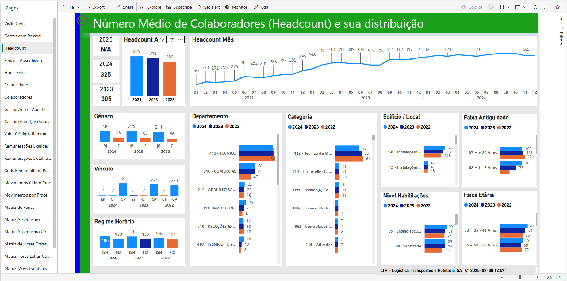 Passemos agora a um exemplo de outra página relevante geralmente considerada nas nossas Soluções BI para RH, a página do Headcount da Organização.