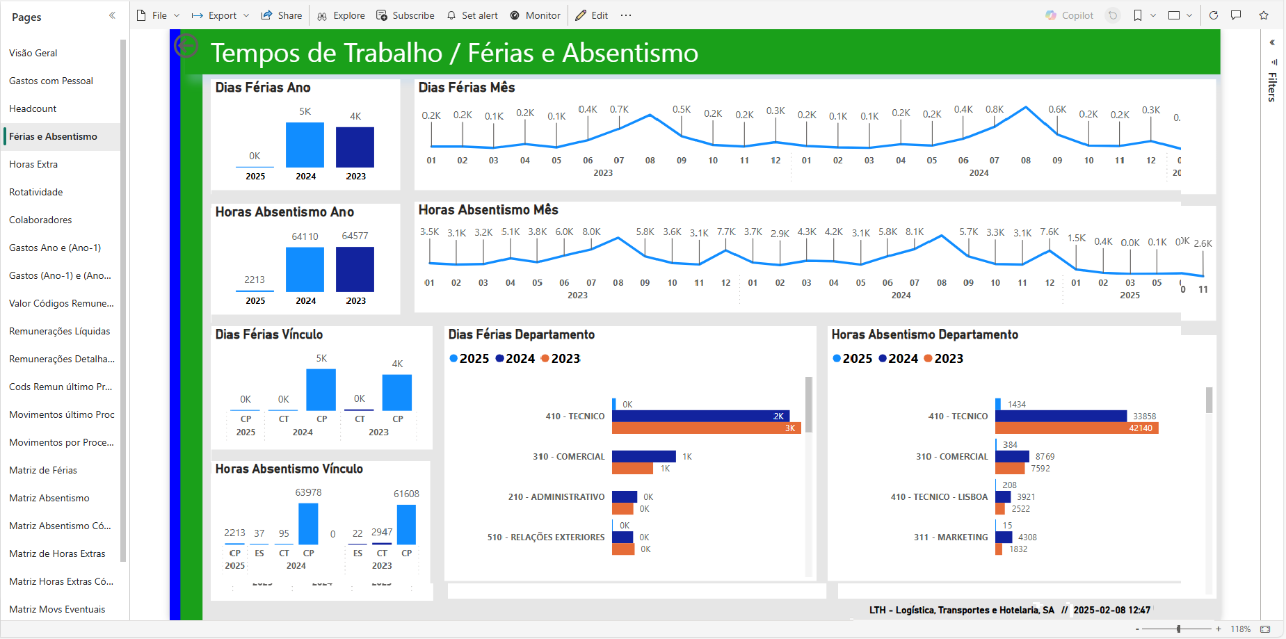 Vejamos agora a página das Férias e Absentismo. Os totais de Férias e Absentismo por Ano e Mês. e as Férias e Absentismo por Departamento e por Ano.